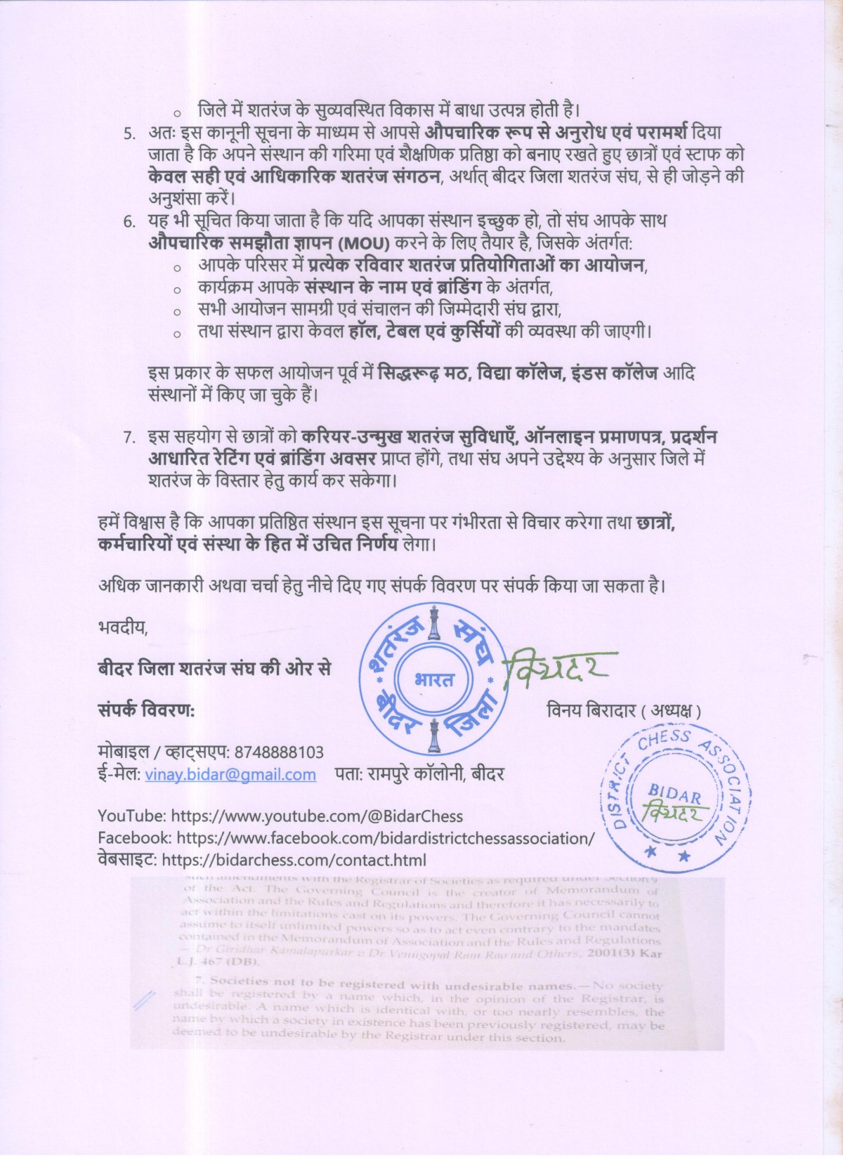 1. यह स्पष्ट किया जाता है कि बीदर जिला शतरंज संघ वर्ष 2012 से नियमित रूप से कार्यरत है तथा इससे पूर्व 2008 से शतरंज गतिविधियों में सक्रिय रहा है। संघ द्वारा: ..... ..... .......