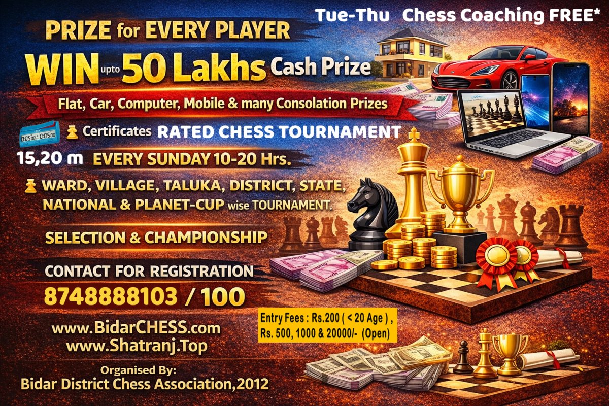 #bidardistrictchessassociation #bidarchess #ratedtournaments #shatranjrating #fiderating #rapid #blitz #classical #randomchess #chess960